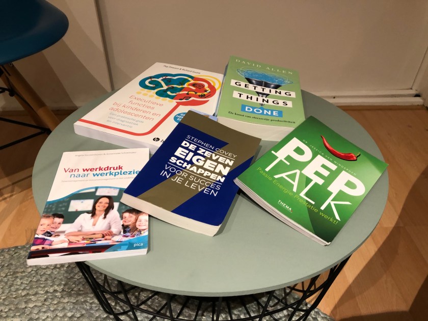 Nu had ik ook al jarenlang twee boekjes op de schap liggen die ik ooit bij een studiedag had gekregen bij mijn vorige werkgever met de titels “van werkdruk naar werkplezier” en “Peptalk; passie, energie, prestatie werkt!” Dus ook die twee boekjes heb ik maar eens even doorgespit.